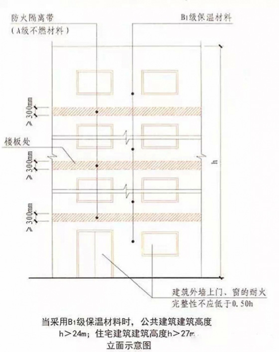 4.當(dāng)建筑的外墻外保溫系統(tǒng)采用燃燒性能為B1、B2級的保溫材料時,除采用B1級保溫材料且建筑高度不大于24米的公共建筑或采用B1級保溫材料且建筑高度不大于27米的住宅建筑外,建筑外墻上門、窗的耐火完整性不應(yīng)低于0.5小時。