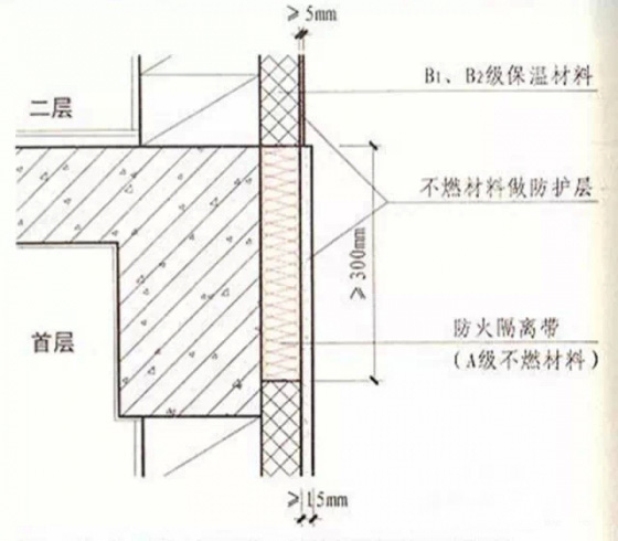 5.在保溫系統(tǒng)中每層應(yīng)設(shè)置高度不小于300毫米且燃燒性能為A級的水平防火隔離帶。防護(hù)層厚度首層不應(yīng)小于15毫米,其它層不應(yīng)小于5毫米。