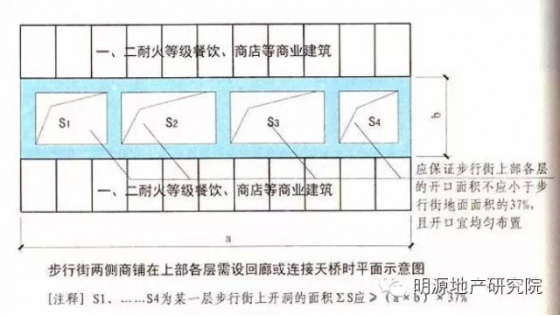 6.步行街兩側(cè)的商鋪在上部各層需設(shè)置回廊和連接天橋時,應(yīng)保證步行街上部各層樓板的開口面積不應(yīng)小于步行街地面面積的37%,且開口宜均勻布置;