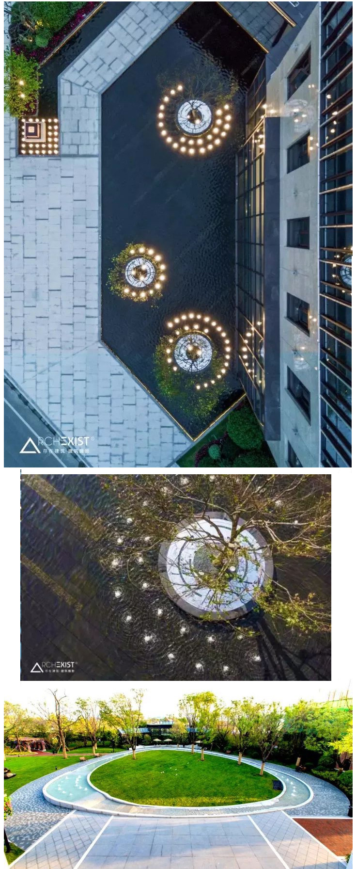 | 另外一種視覺享受,它是水中的種植池,有樹有草有石,一圈外圍隨型而置的燈光,好似珍珠散落。 |