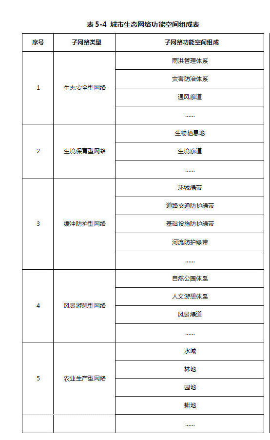 按照生態(tài)網(wǎng)絡(luò)功能用途,分別建構(gòu)生態(tài)安全型網(wǎng)絡(luò)、生境保育型網(wǎng)絡(luò)、緩沖防護(hù)型網(wǎng)絡(luò)、風(fēng)景游憩型網(wǎng)絡(luò)以及農(nóng)業(yè)生產(chǎn)型網(wǎng)絡(luò)五種類型的功能性子網(wǎng)絡(luò)。(詳見(jiàn)表5-4)