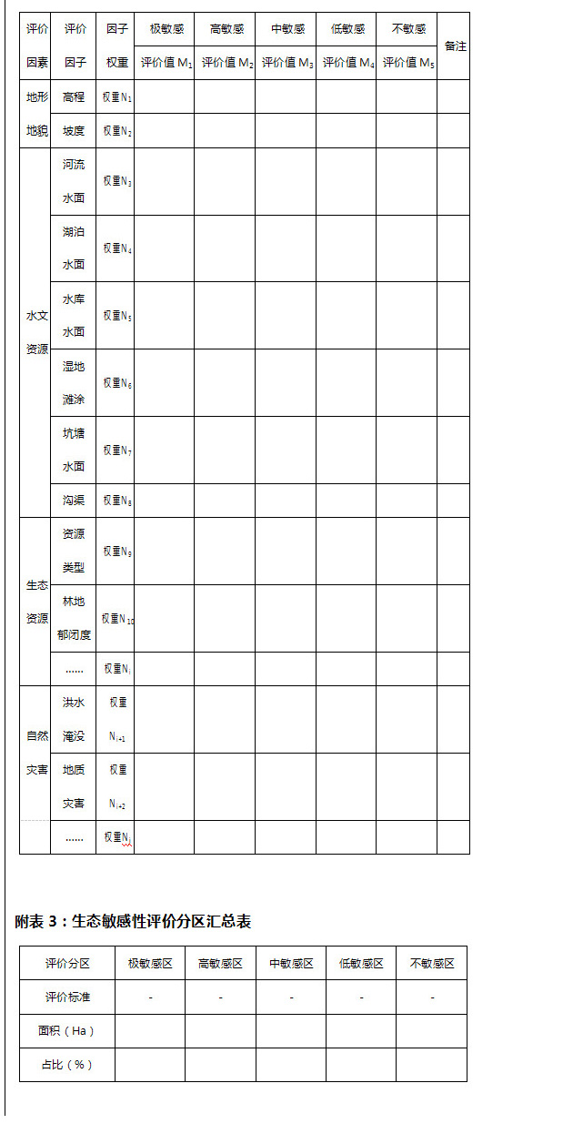生態(tài)敏感性評(píng)價(jià)應(yīng)首先構(gòu)建評(píng)價(jià)體系并選取生態(tài)敏感性因子,明確評(píng)價(jià)模型及方法,確定評(píng)價(jià)標(biāo)準(zhǔn)并最終明確生態(tài)敏感性的空間分布(詳見(jiàn)附表2)。
