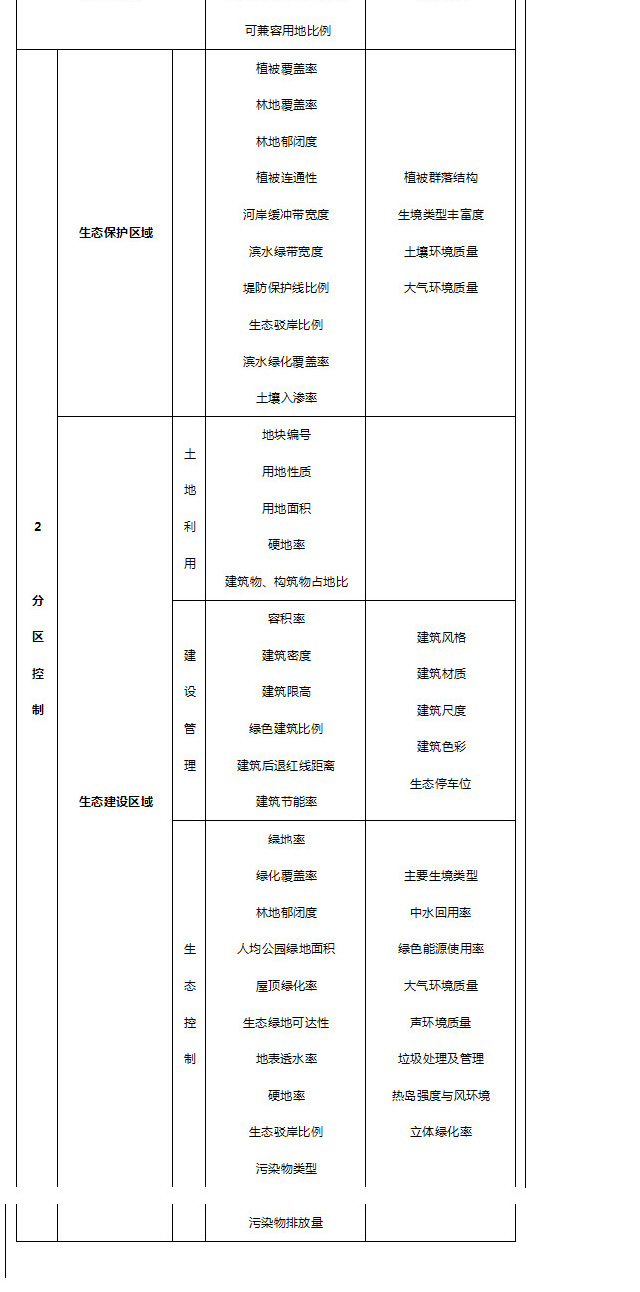 生態(tài)控制類的控制性指標(biāo)包括綠地率、綠化覆蓋率、林地郁閉度、人均公園綠地、屋頂綠化率、生態(tài)綠地可達(dá)性、地表透水率、硬地率、生態(tài)駁岸比例、污染物排放量等;引導(dǎo)性指標(biāo)包括主要生境類型、中水回用率、綠色能源使用率、大氣環(huán)境質(zhì)量、聲環(huán)境質(zhì)量、垃圾處理及管理、熱島強(qiáng)度與風(fēng)環(huán)境、立體綠化率等。