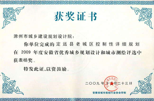 明光市中心城區(qū)規(guī)劃獲獎證書